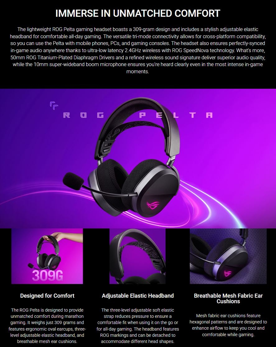ASUS ROG Pelta White su bežične gaming slušalice s tri načina povezivanja (2.4 GHz SpeedNova, Bluetooth i USB-C), 50 mm titanium-plated driverima i do 70 sati trajanja baterije. Ergonomskog su dizajna, a odvojivi boom mikrofon omogućuje jasnu komunikaciju tijekom igranja.