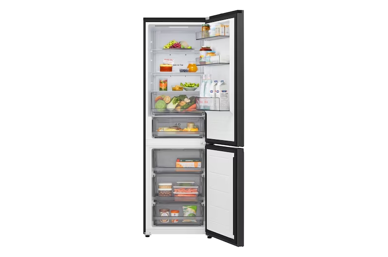 LG GBBSJ10DEP je kombinovani frižider s donjim zamrzivačem i ukupnim neto kapacitetom od 333 litara, dizajniran za jednostavno i efikasno čuvanje hrane. Opremljen je modernim tehnologijama hlađenja poput DoorCooling+™ i LinearCooling™ koje održavaju ravnomjernu temperaturu i svježinu namirnica. ThinQ™ Wi-Fi funkcija omogućuje pametno upravljanje putem aplikacije, a inverter kompresor pruža tihi rad uz energetsku učinkovitost. Elegantni crni dizajn i praktične police čine ga pogodnim za svaku kuhinju.