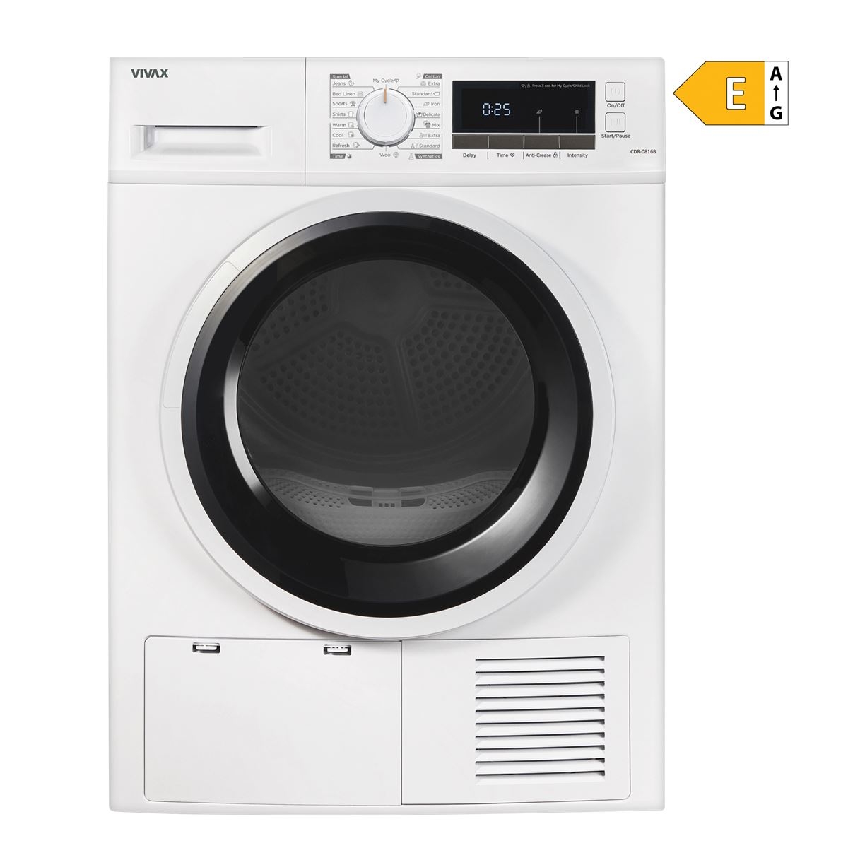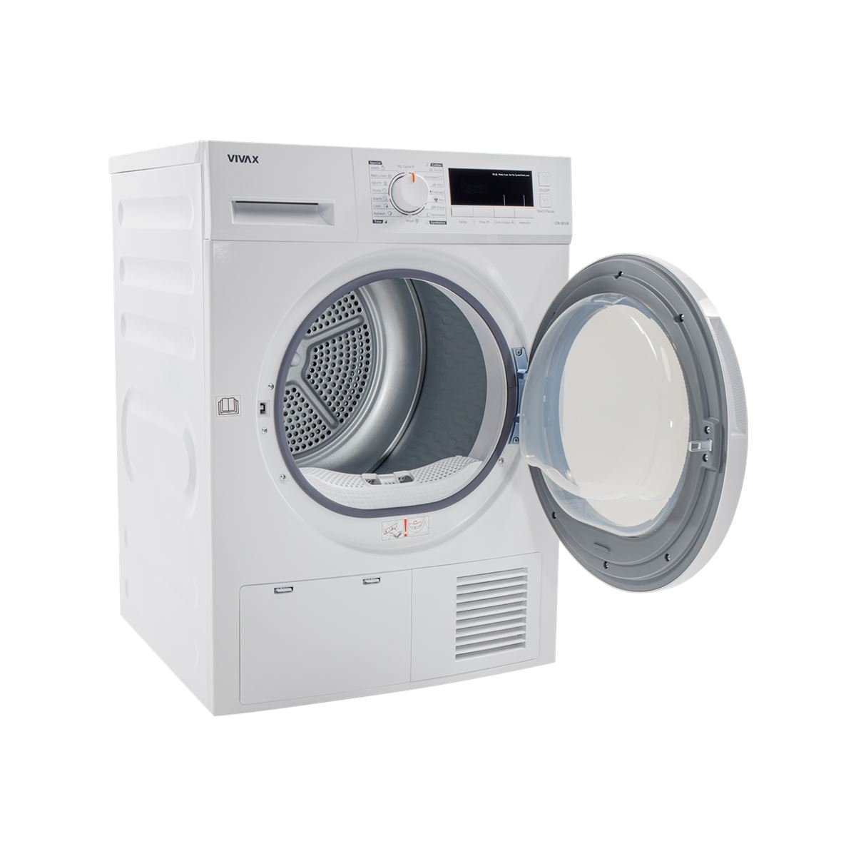 Kontrolna ploča VIVAX sušilice rublja CDR-0816B ima centralno smješteni okretni gumb za odabir programa i veliki zaslon – njima se u svega tri jednostavna koraka pokreće proces sušenja: uključi se sušilica rublja, odabere se program te se pritisne start.